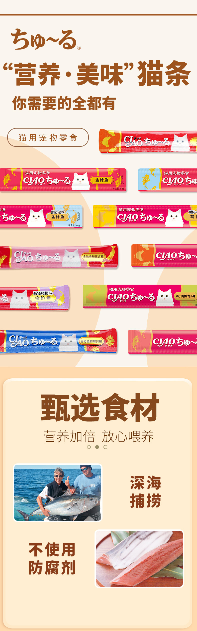 伊纳宝啾噜猫条猫咪零食湿粮Ciao金枪鱼味营养补水是一款专为猫咪设计的高品质宠物食品,旨在提供猫咪所需的营养和水分,特别适合那些挑食或者对湿粮有偏好的猫咪。您可以根据这一产品特点,满足市场上对健康、营养、且富含水分的猫咪食品的需求。以下是该产品的信息,供您参考: