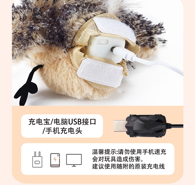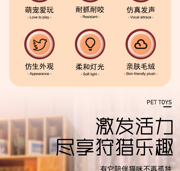 这款玩具采用高质量的毛绒面料,模*实小鸟的外形,色彩鲜艳且具备高度的*度,非常容易激起猫咪的猎食本能。玩具内部设计了触动感应功能,一旦猫咪接触到玩具,它就会发出声音,这样的设计不仅增加了猫咪的游戏乐趣,还能提高猫咪的活跃度。对于喜欢抓扑、跳跃的猫咪来说,这款逗猫棒玩具可以极大地激发它们的兴趣,并且帮助它们进行必要的运动,避免猫咪因缺乏活动而产生肥胖或其他健康问题。