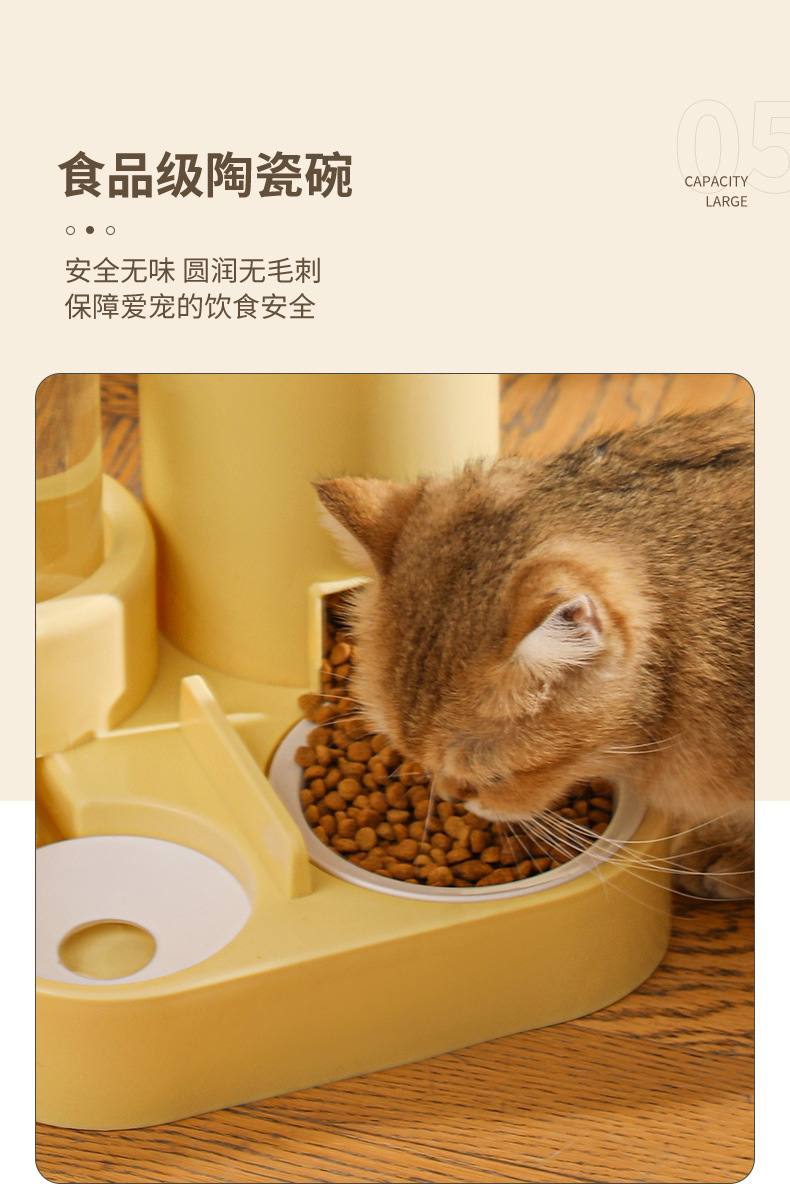 三合一设计: 这款自动猫咪喂食喂水器集喂食、喂水、饮水三大功能于一体,简化了宠物的日常用具,既节省空间,又提高了使用效率。宠物主人不再需要分别购买多个用品,减少了生活空间的占用。